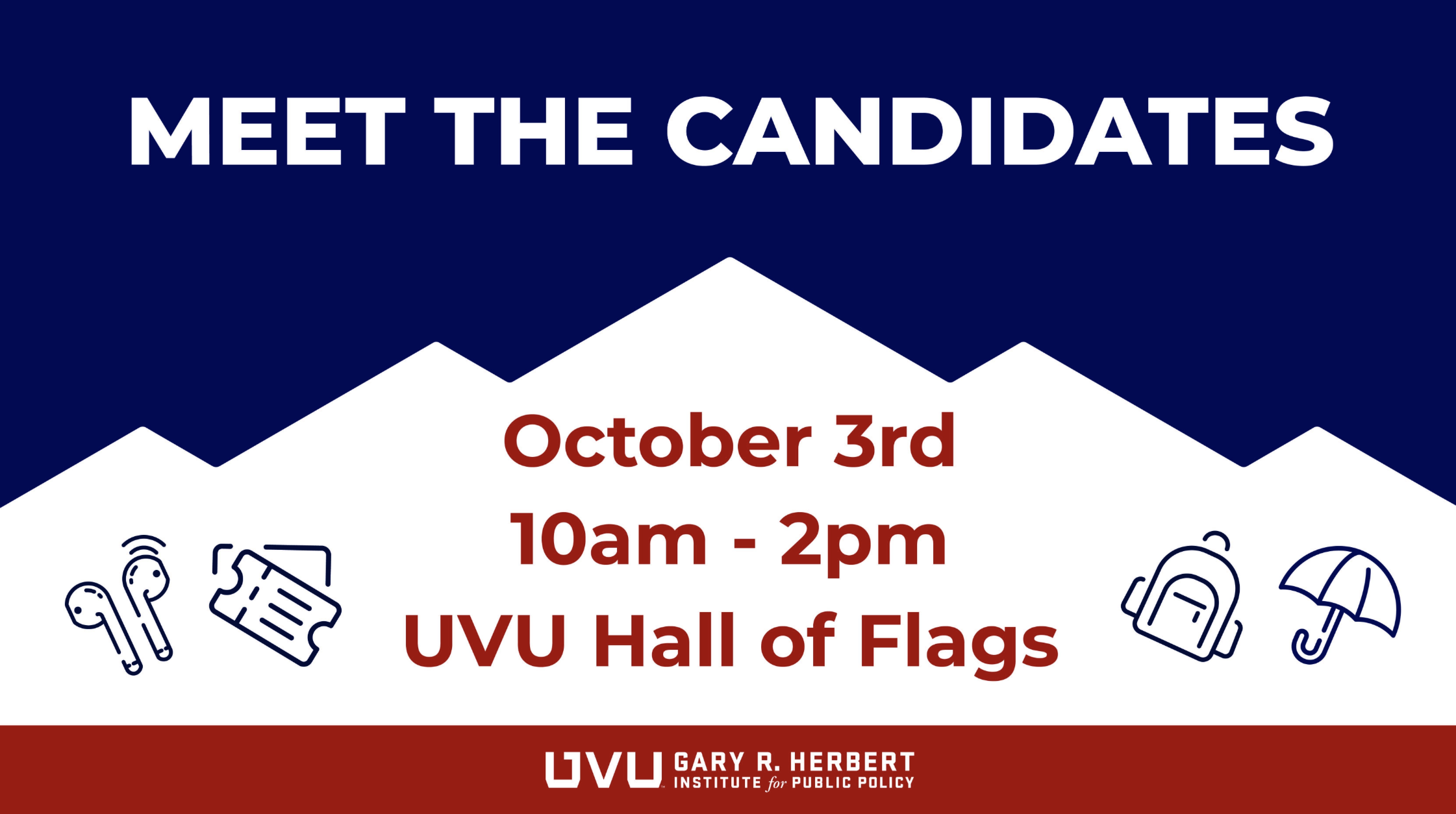 The Herbert Institute invites all UVU students, faculty, and staff to join us for our "Meet the Candidates" event, on Thursday, October 3, 2024 from 10 a.m. to 2 p.m. in the Hall of Flags (HF). Statewide and Congressional candidates will be present, giving the UVU community the opportunity to engage directly with candidates on important issues before heading into the general election.